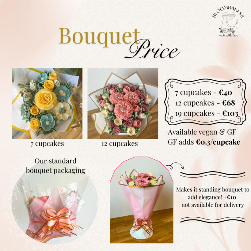 At Bloombake, we turn cupcakes into floral art.Based in Vienna, we create handcrafted cupcake bouquets that are as beautiful as they are delicious — perfect for birthdays, surprises, or just to brighten someone’s day. Every bloom is baked fresh with love, combining delicate design with homemade flavor.Treat someone special (or yourself!) to a gift that tastes as lovely as it looks.
